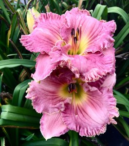 “PINK LEMONADE SUMMER” $40 || (Fow 8-42) Fowler-B TET. 5.5” bloom 32” scape 3-way branching 20 bud count. SEV. R. (continuous blooming) Light pink sepals, darker pink petals lightly ruffled with a line of gold edging. Chartreuse throat. (Beautiful Regina x True Pink Beauty)